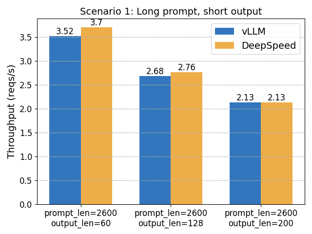 • DeepSpeed-FastGen only outperforms vLLM in scenarios with long prompts and short outputs, due to its Dynamic SplitFuse optimization. This optimization is on vLLM’s roadmap.